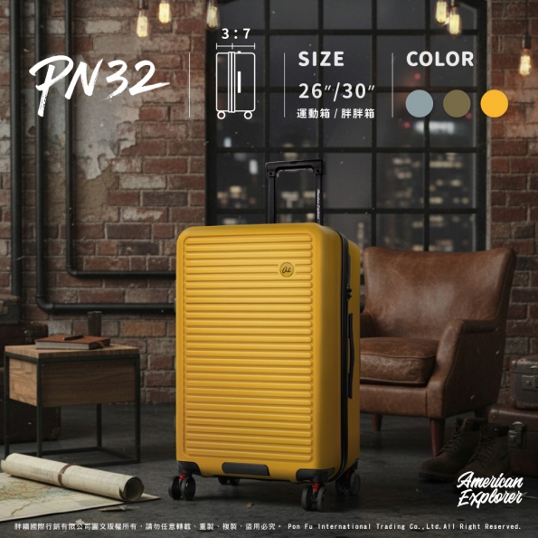 26吋 PN32 胖胖箱/運動箱 TSA國際海關鎖 防爆/防盜拉鏈 靜音剎車彈簧...NT$ 1,088加入購物車26吋 PN32 胖胖箱/運動箱 TSA國際海關鎖 防爆/防盜拉鏈 靜音剎車彈簧輪 行李箱 輕量 大容量 American Explorer 美國探險家 霧面防刮 旅行箱