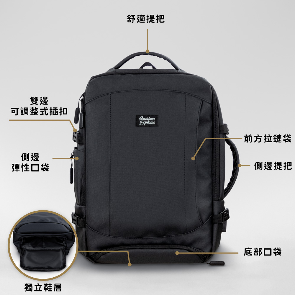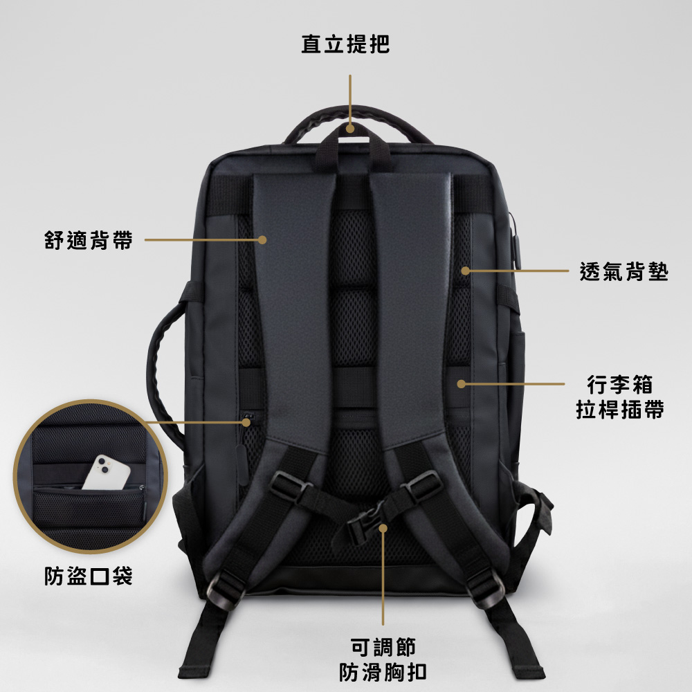● 拉桿插帶設計,背包可插掛於行李箱拉桿,減輕肩膀負擔